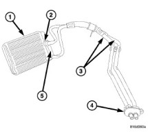 Der hintere Heizungswärmetauscher (1) besteht aus Rohrreihen und Rippen. Der hintere Wärmetauscher befindet sich im Gehäuse der hinteren Heizungs-/Lüftungs-/Klimaanlage hinter der rechten Seitenverkleidung und ist im Gehäuse mit einer Kunststoffhalterung und einer Schraube befestigt. Die Wärmetauscher-Leitungen (3) sind am Wärmetauscher-Tank angeschlossen und mit Metallhalteklammern (5) und Gummi-O-Ring-Dichtungen über einen Kunststoffflansch am Gehäuse der Heizungs-/Lüftungs-/Klimaanlage befestigt.