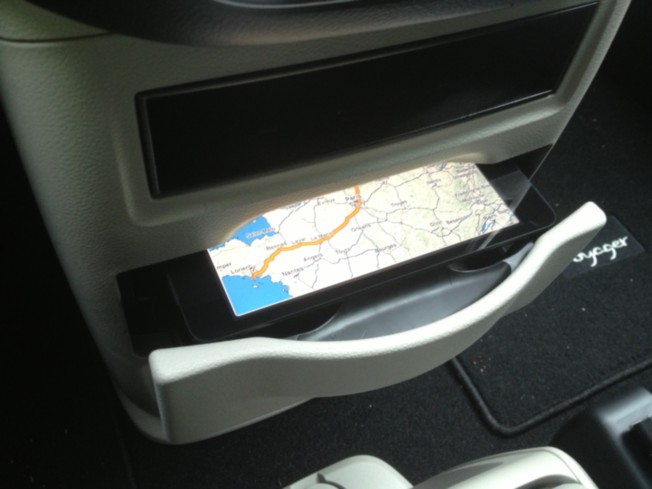 • Danke für die Antworten: Ich habe zwei Lösungen gefunden: Zum einen habe ich mir für mein iPhone 4S für 17,75 EUR die MacAlly "MCup Flexibel Auto Cup Halter für Apple iPhone und iPod schwarz" gekauft (Amazon Link) und zum anderen hatte ich bei eBay ein interessantes iPad Angebot gefunden. Da konnte man ein iPad Mini 32 GB mit 3G für eine Zuzahlung von 39,- EUR und eine monatliche Gebühr von 25,- EUR mit einem 2 Jahres-Vertrag von Vodafone bekommen (Voraussetzung, unter 25 Jahre, Student oder selbständig). Das iPad Mini kann im Auto als WLAN-Hotspot dienen und hat ein monatliches Volumen von 5 GB. Es hat zwar von der Bestellung bis zur Lieferung knapp zwei Wochen gedauert, aber es kam dann tatsächlich (ich war bis zum Schluß skeptisch). Dann habe ich aus der Aschenbecher/Cupholder-Schublade den Gummieinsatz rausgefummelt und siehe da, dass iPad Mini passt da genau rein. Man kann die Schublade schließen und das iPad Mini verschwindet vollkommen. Wenn man die Schublade ca. 2 cm reinfährt liegt es leicht schräg - aber trotzdem sicher - drin und man kann es beim Fahren gut lesen und der GPS-Empfang geht auch gut.