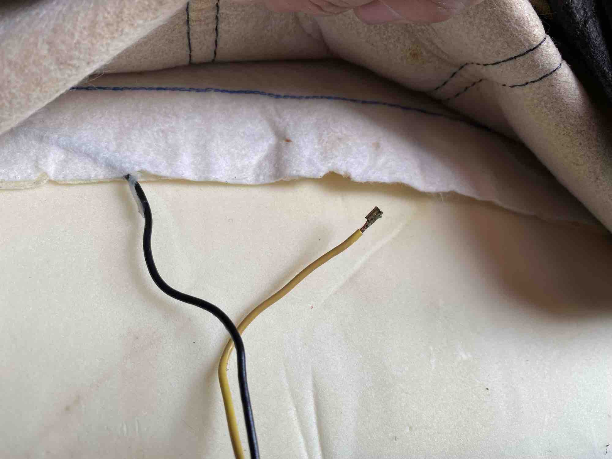 Fehler gefunden. Das Kabel direkt an der Matte abgerissen (an der Crimpstelle). Habe meine Hand von hinten unter den Rückenbezug geschoben und mit den Fingern das lose Kabelende gefühlt. Musste den Rückenbezug dann auch auf der Vorderseite etwas lösen, dann habe ich das lose Kabel gesehen. Musste den Filz von der Heizmatte etwas aufschneiden und dann habe ich die beiden Kabelenden wieder verbunden (gelötet).