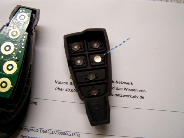 Steffen gab mir den Tip mal nachzuschauen, ob der Lancia Gold den Fernstart nicht schon drin hat. Und er hatte recht. Mit seiner Hilfe war das relativ schnell aktiviert. Etwas hakelig war es, den Schlüssel anzupassen. Auf der Platine ist alles drauf, aber der Knackfrosch am Gummi fehlte. Diesen fand ich dann in einem Mikrotaster mit 7 mm Raster, auf einem alten Toastermainboard. Das Plättchen habe ich hinten angerauht, alles entfettet, mit UHU strong & safe an der markierten Stelle aufgeklebt und 2 Std. trocknen lassen.
