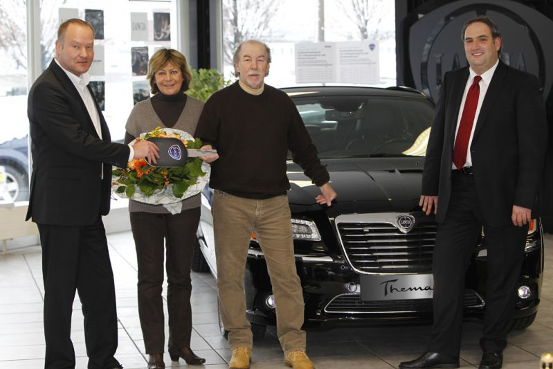 Im neuen Lancia Thema findet das Beste aus zwei Welten zusammen - das beweist auch einer seiner prominenten Besitzer: Jürgen Grabowski, Fußball-Weltmeister von 1974 und Spieler-Legende von Eintracht Frankfurt, übernahm in der Lancia-Niederlassung Wiesbaden einen neuen schwarzen Lancia Thema. „Als ich den Lancia Thema zum ersten Mal gesehen habe, wusste ich sofort: Den würde ich gerne fahren", sagte Grabowski bei der Übergabe.