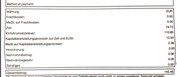 plus Kapitalbereitstellungsprovision auf Zoll und EU-St: 12,50€