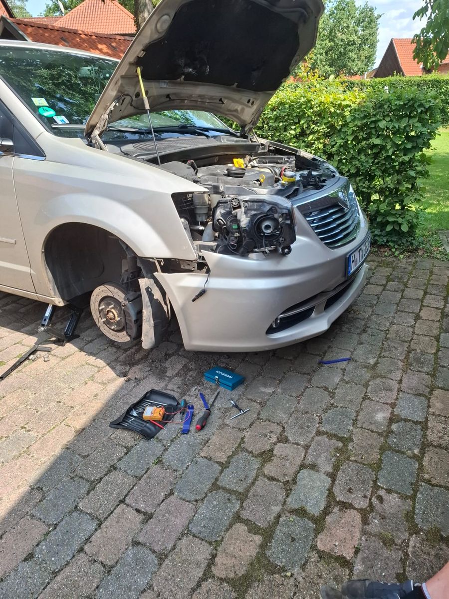 Mit dem Foto wollte ich zeigen, wie servicefeindlich der „moderne“ Fahrzeugbau inzwischen geworden ist: Beim Chrysler Voyager (Bj. 2015) muss man für ein flaches Xenon-Vorschaltgerät das Rad, die Radhausschale, den Stoßfänger und den Scheinwerfer ausbauen – über 15 Befestigungen.